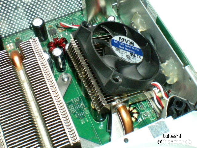 Der GPU Kühler hatte noch den kleinen Anbau. Den habe ich so weit gekippt wie es geht. Dafür musste auch unten drunter ein Elko weichen, den hab ich hingelegt und mit kurzen Kabeln angeschlossen. Auf den Kühler-Anbau kam ein kleiner Lüfter, ebenfalls nochmal gekippt. Der bläst nun die Luft leicht seitlich (und nicht diekt von oben) die Luft durch den Anbau in Richtung CPU Kühler. Das dürfte wohl der einzige Ort sein, an dem ein Zusatzlüfter was bringt.