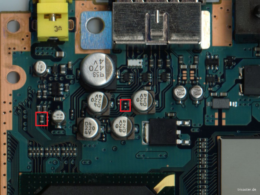 Am linken Widerstand (47 Ω) kann am unteren Kontakt C-Sync abgegriffen werden. Am rechten Widerstand (75 Ω) kommt unten FBAS rein und geht oben raus. Dier Widerstand muss raus bzw. am unteren Kontakt unterbrochen werden. Über die 75 Ω wird CSYNC an dem oberen Pad angelegt.