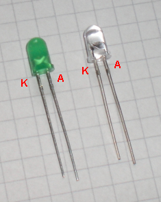 Auf den LEDs ist kein Strich zur Markierung der Kathode, sondern eine Kerbe an der Seite. Bei neuen LEDs ist das Beinchen an der Kathode etwas kürzer, aber das hilft natürlich bei einer gebrauchten nicht. Wenn man in die Diode hineinsehen kann, kann man auch mit dem Aussehen die Anschlüsse bestimmen. An der Anode ist ein kleiner "Kelch" zu sehen, wie hier bei der transparenten LED schwach zu sehen.