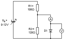 Es handelt sich primär um einen Spannungsteiler (R1 und R2), der die Testspannung für die in Durchlassrichtung angeschlossene Diode erzeugt. Das Voltmeter misst die Spannung, die an D1 anliegt, während das Ampèremeter den Strom durch die Diode misst. Aus den Werten lässt sich dann wieder eine Tabelle anlegen und eine Kennlinie zeichnen.