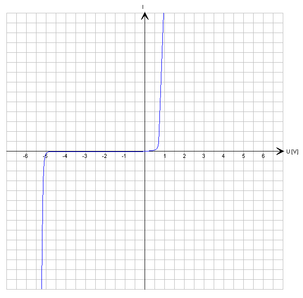 Durch einen kleinen Handgriff kann man einen Spannungsteiler stark verbessern. Dies macht eine Diode möglich. Hierbei handelt es sich jedoch nicht um eine herkömmliche Diode, sondern um eine "Z-Diode" (Z für Zener, ohne H). In Durchlassrichtung verhält sie sich wie eine normale Diode, ab 0,7V ist sie leitend. In Sperrichtung sieht es aber anders aus. Da sperrt sie nur bis zu einer gewissen Spannung, danach wird sie auch da leitend. Dementsprechend sieht die Kennlinie einer Z-Diode aus (wieder nur zweckmäßig).