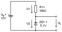 U1 beträgt 6,9V, damit fließt ein Strom von 69mA. Das heißt für die Z-Diode, dass sie 352mW in Wärme umsetzt. Meistens haben die Z-Dioden eine Leistungsaufnahme von bis zu 500mW, also passt es noch. Schließt man an die Klemmen einen Widerstand an, dann hält die Z-Diode die Spannung konstant. Der Strom durch die Diode sinkt jedoch ab, so dass dieser Strom addiert mit dem Laststrom immer gleich bleibt (und somit die Spannung an R1).