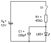 Wird der Schalter S1 (Taster) geschlossen, fließt ein Strom durch R1 und LED1 (rot), die LED leuchtet und der Kondensator lädt sich auf. Eventuell leuchtet die LED anfangs nur schwach, weil der Kondensator leer ist und der LED erst einmal den Strom zum Laden "klaut".